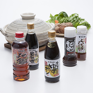 鳥取県特産品の「砂丘らっきょう」のエキスがたっぷり入った「らっきょうドレッシング」、「焼き肉のタレ」をはじめ、山陰海岸の荒波で育った天然の岩牡蠣を贅沢に使用した「牡蠣醤油」、種から生木まで18年以上もかかると言う“幻の柚子”実生の柚子を使った「ゆずポン酢」、鳥取特産のカニや野菜の旨みをより一層引き立てる「寄せ鍋つゆ」をセットにしました。